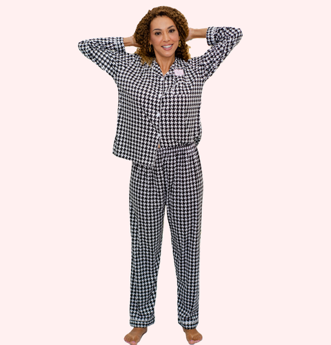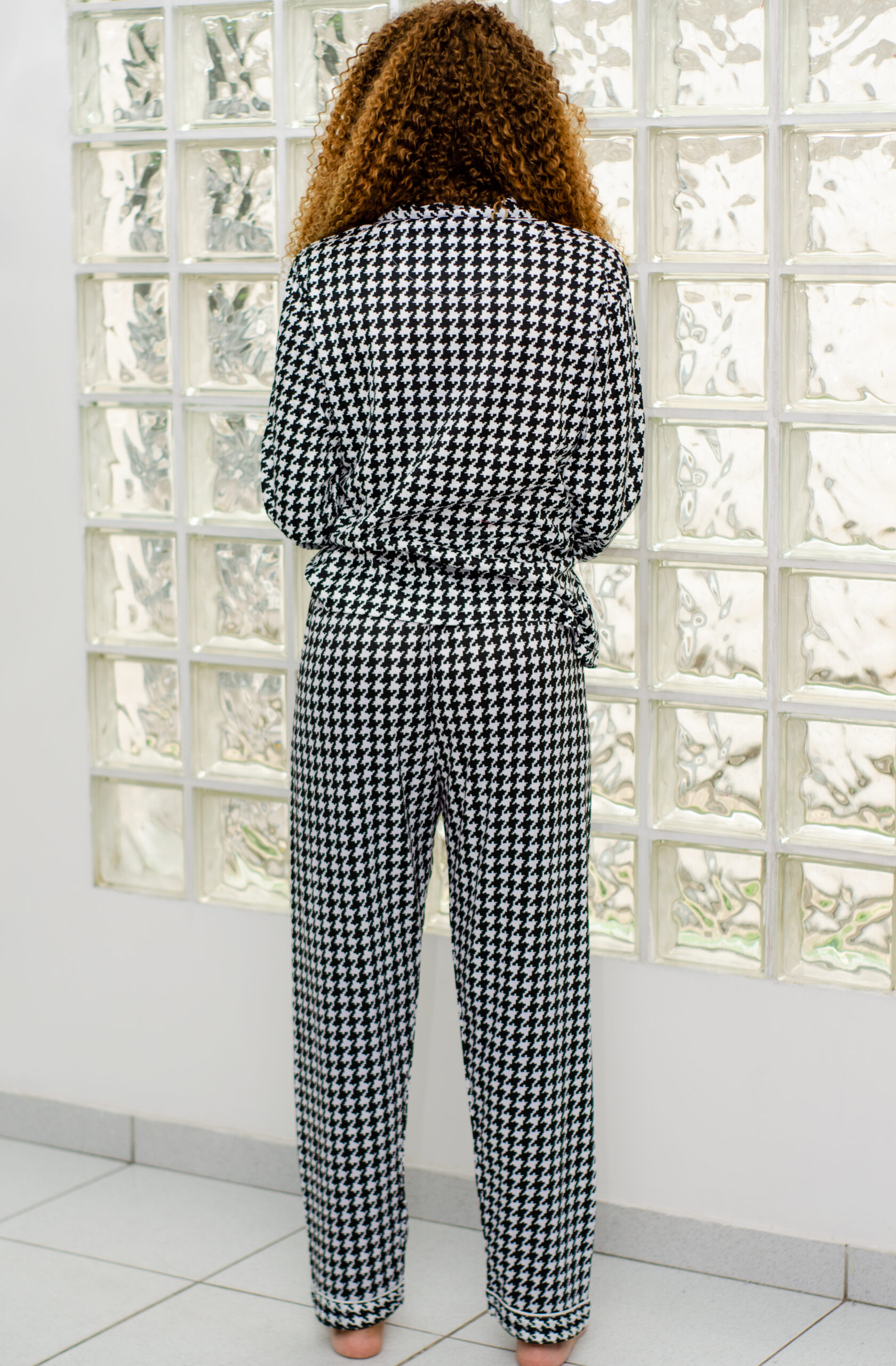 Clássico, quentinho e cheio de estilo! Esse pijama de inverno é confeccionado em tecido macio e aconchegante, garantindo máximo conforto nos dias frios. A estampa pied de poule, atemporal e elegante, transforma a peça em um verdadeiro destaque para quem gosta de unir moda e bem-estar até na hora de dormir.