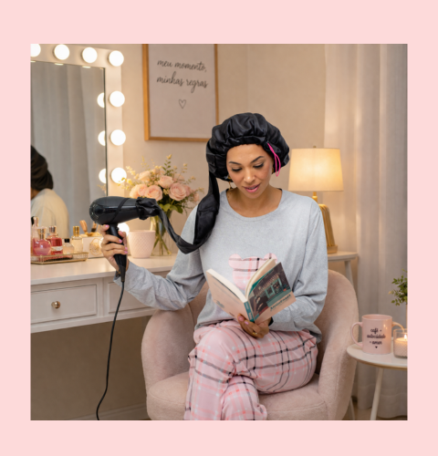 O ar entra pelo “braço” da touca se espalhando dentro dela, a qual irá inflar e permitir a circulação de ar dentro dela, fazendo com que os fios sequem de maneira uniforme, e você pode ainda estar fazendo algo enquanto isso, se maquiar, ler um livro, dar andamento no trabalho, é só apoiar o secador e aguardar o resultado 🙂